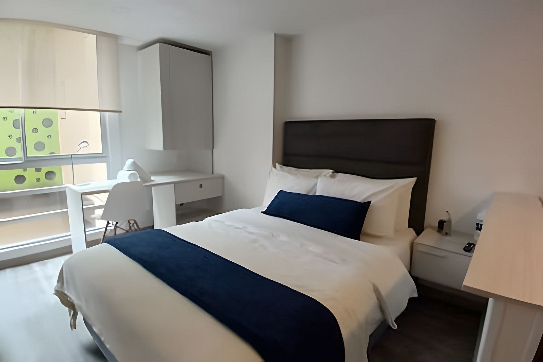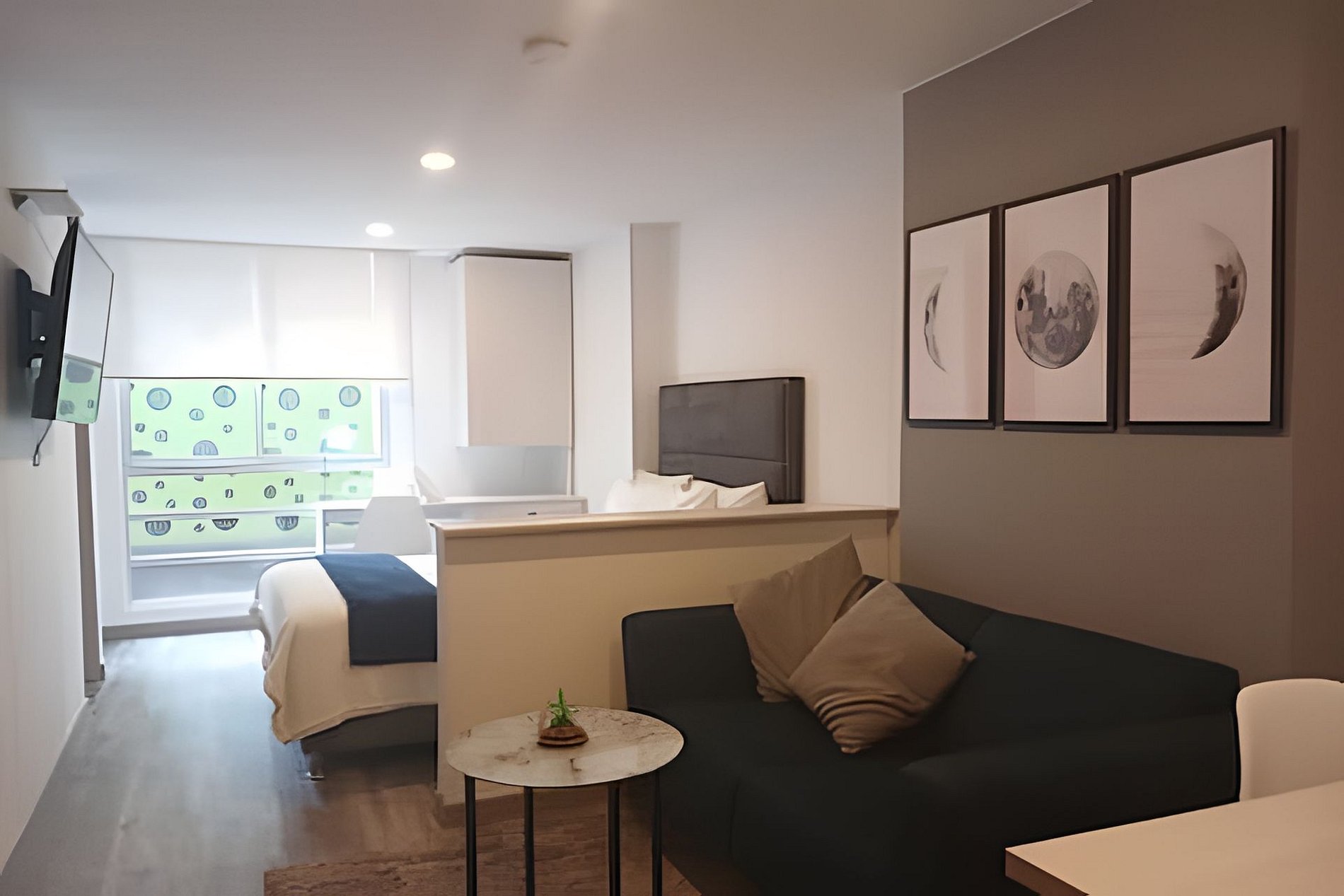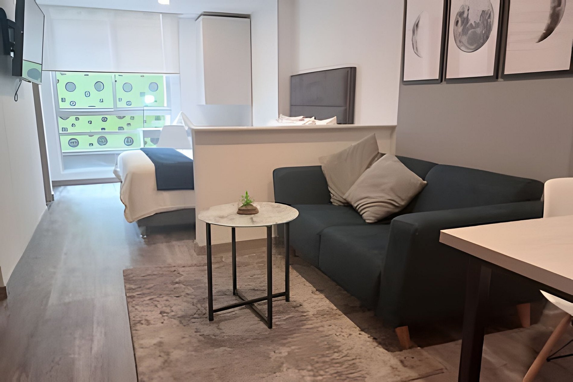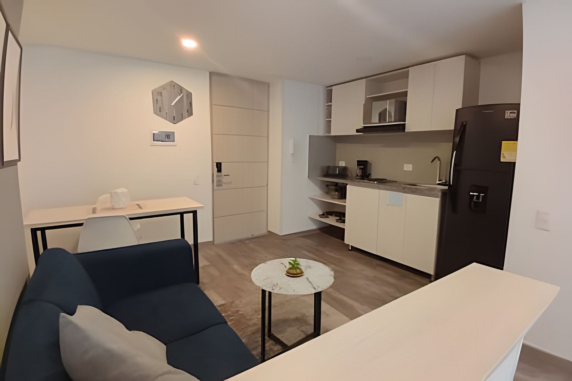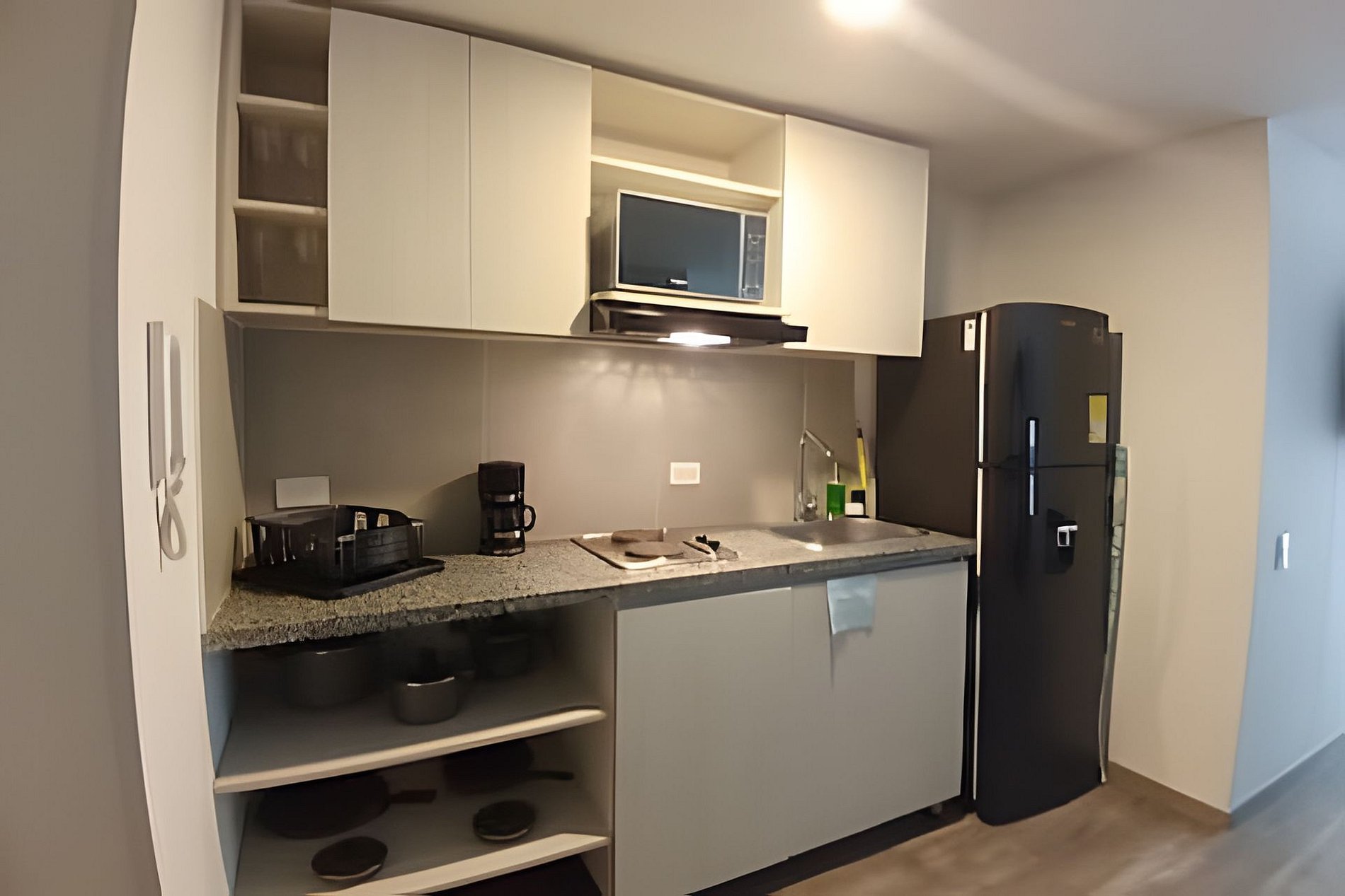 En este espectacular apartaestudio completo de un solo ambiente que contiene: su dormitorio con cama doble y un sofá cama doble, armario, baño y cocina equipada, comedor, escritorio y un espacio con vista. En el edificio encontraras recepción 24 horas, parqueadero pagando, ascensores, terrazas con vistas espectaculares, zonas de lavanderias y de juegos, sala de star. ¡Será muy fácil planear tu visita!