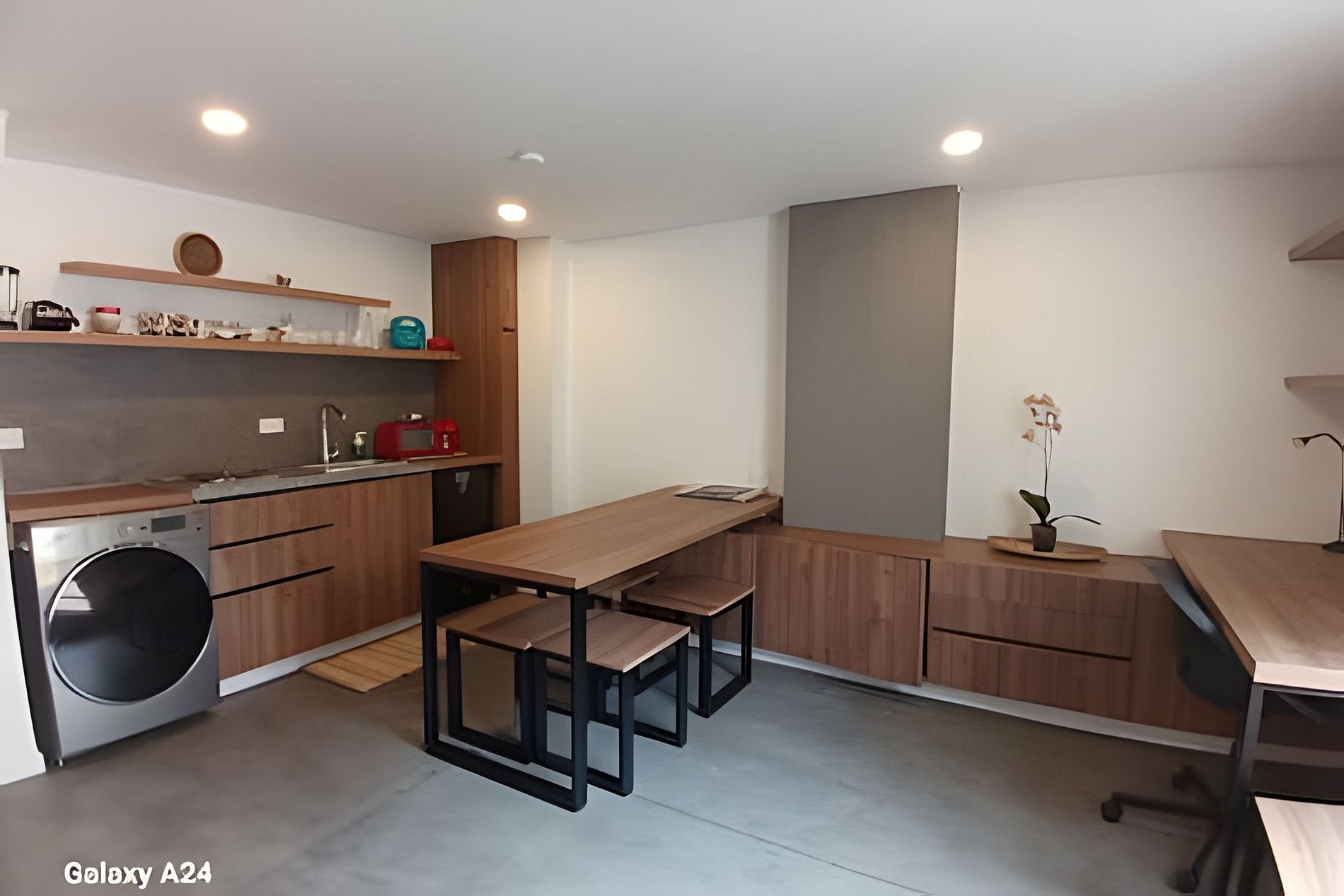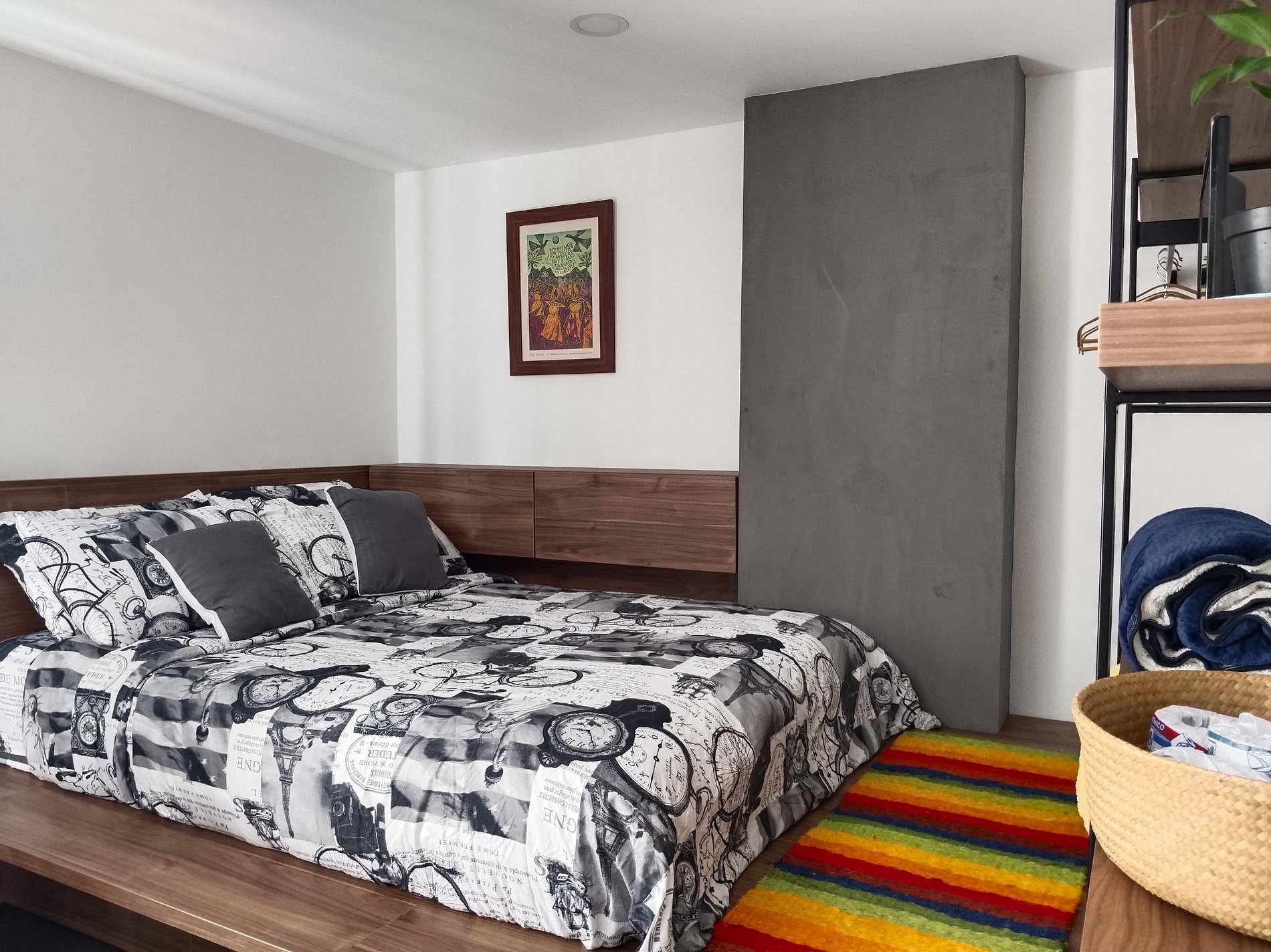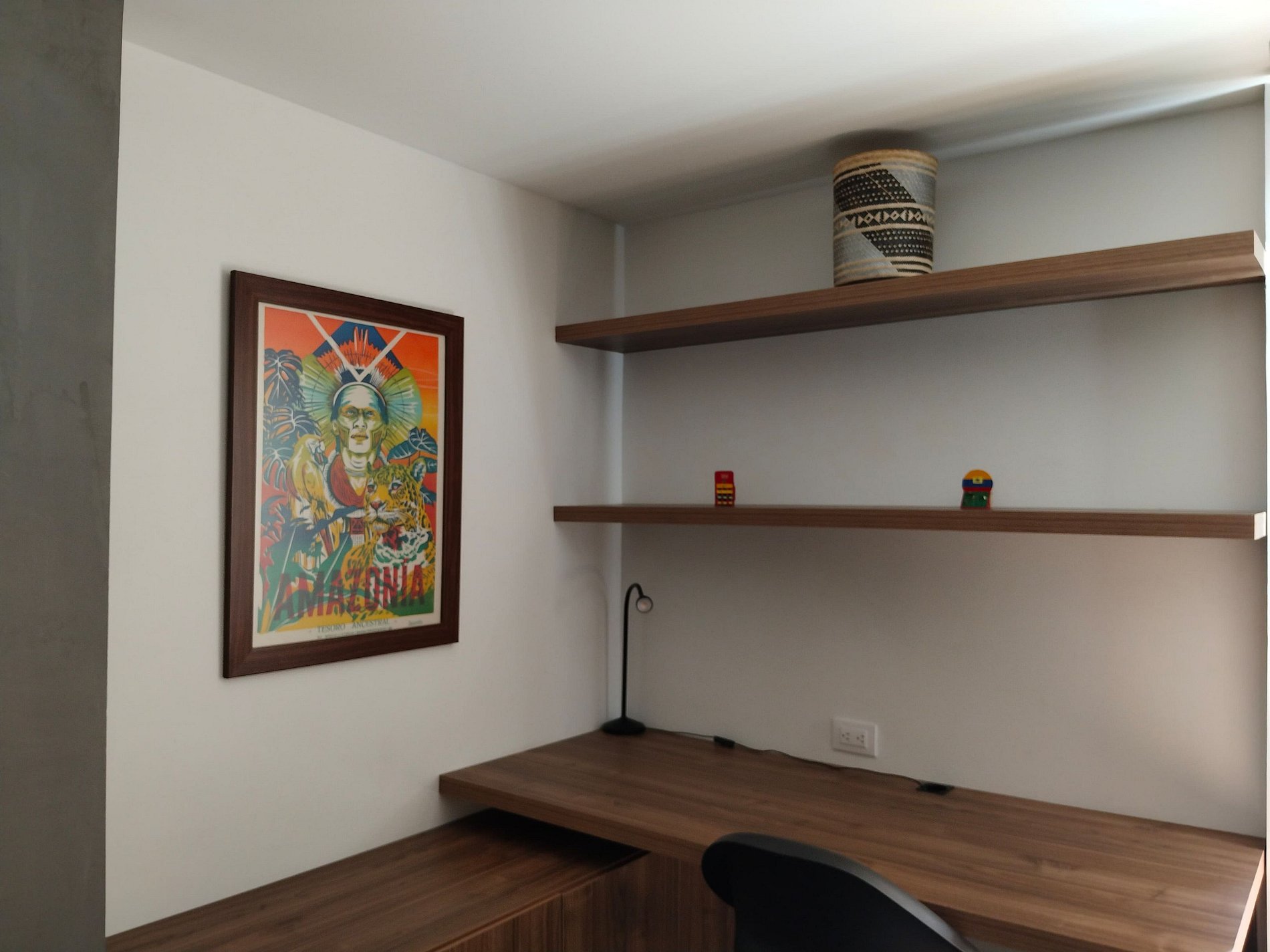 En este espectacular apartaestudio completo de un solo ambiente que contiene: su dormitorio con cama doble y un futón doble el cual esta en los cajones debajo de la cama con su bomba y accesorios, armario, baño,lavadora secadora, cocina con sus amenidades, comedor, escritorio y un espacio con vista. En el edificio encontraras recepción 24 horas, parqueadero pagando, ascensores, terrazas con vistas espectaculares, zonas de lavanderias y de juegos, sala de star. ¡Será muy fácil planear tu visita!